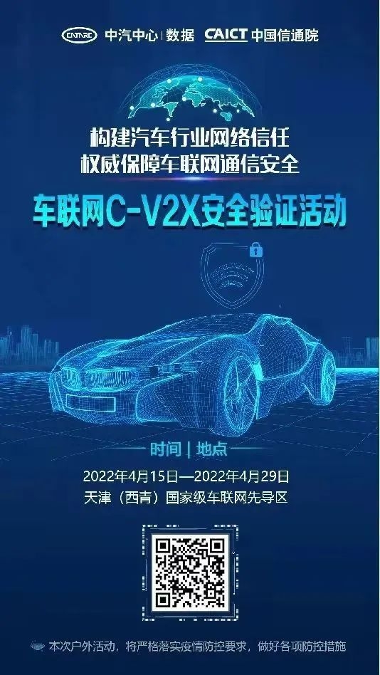 为贯彻落实《新能源汽车产业发展规划(2021-2035年)》《智能汽车创新发展战略》和车联网产业发展专委会第四次全体会议工作任务要求,加快推进车联网网络安全保障能力建设,构建车联网身份认证和安全信任体系,推动商用密码应用,保障蜂窝车联网(C-V2X)通信安全,服务车联网(智能网联汽车)产业高质量发展。在工业和信息化部网络安全管理局指导下,中汽数据有限公司将联合中国信息通信研究院,于2022年4月15日在天津(西青)国家级车联网先导区开启2022车联网C-V2X安全验证活动,与产业一道,共同开展车联网安全实践。