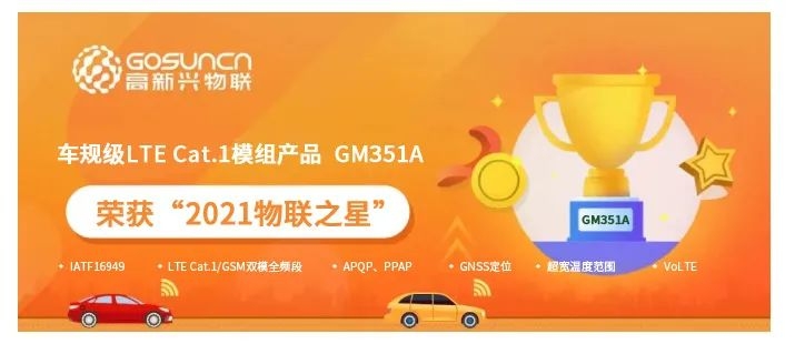 2022年3月16日,“2021物联之星”中国物联网产业年度评选结果正式公布。高新兴物联科技有限公司的车规级LTE Cat.1模组产品GM351A最终从数百余家参评企业产品中脱颖而出,获得了“最佳创新产品奖”。