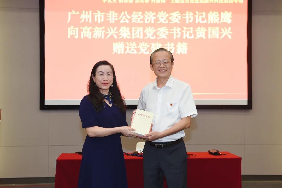 广州市非公经济党委书记熊鹰向高新兴集团党委赠送党建书籍,高新兴集团党委书记黄国兴代为受赠。