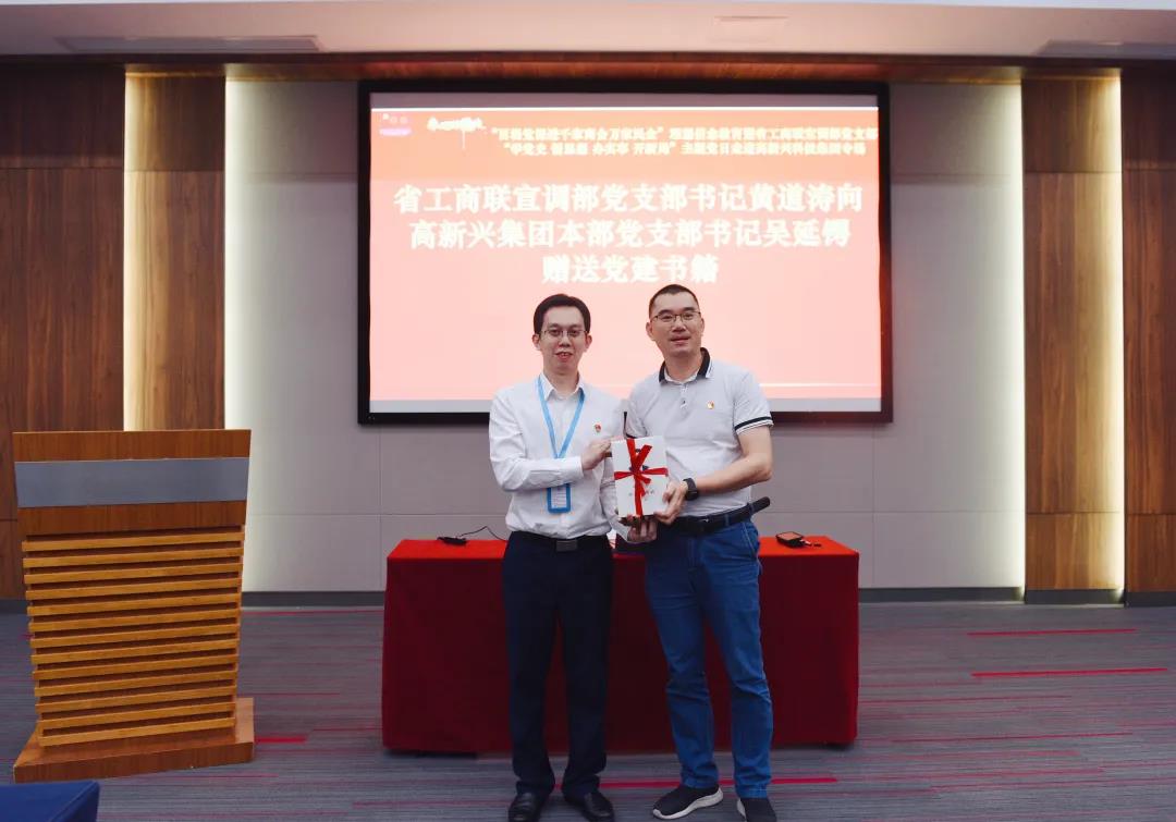 省工商联宣调部党支部书记黄道涛向高新兴集团本部党支部赠送党建书籍,高新兴科技集团本部党支部书记吴延锷代表受赠。