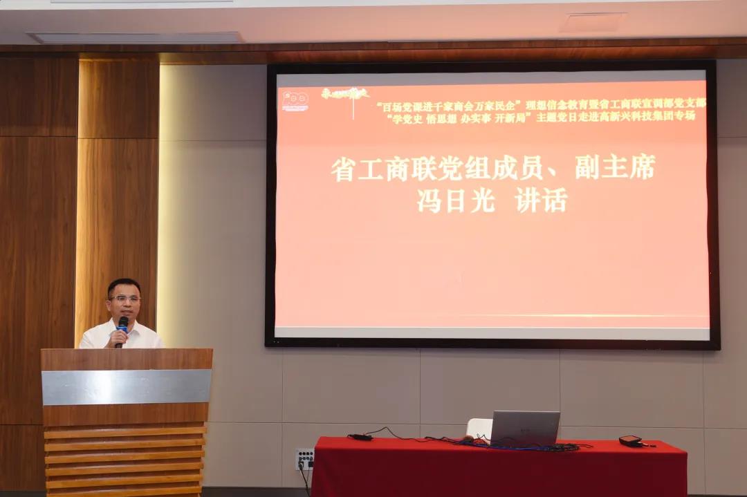 奏唱国歌后,省工商联党组成员、副主席冯日光发表讲话。冯主席在讲话中对高新兴集团党建工作给予了充分肯定,对省工商联系统开展“百场党课进千家商会万家民企”理想信念教育活动的背景、意义和进展情况作了介绍。