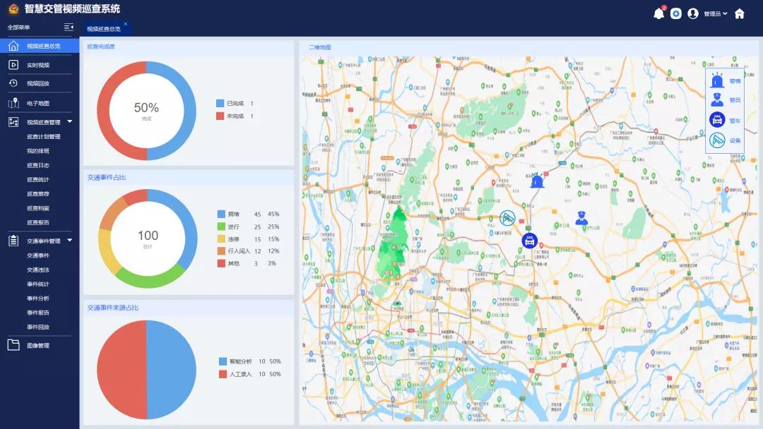 一图总览,视频巡查完成度、交通事件占比、交通事件来源占比图表统计,交通态势一目了然;设备、警情、警员、警车二维地图定位,巡查管理直观便捷。警员排班管理、巡查计划管理、巡查报告日志,智能化、自动化开展巡查工作,有利于警力资源的合理分配,降低一线交警工作强度。