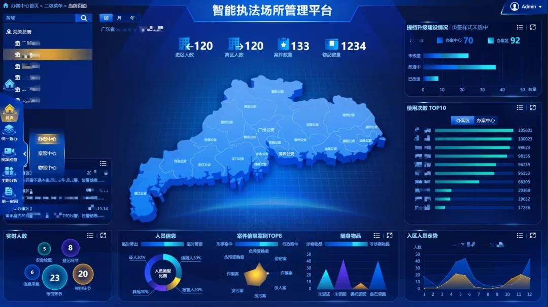 高新兴智慧执法管理平台,实现对执法办案的智能监督、风险预警、智能研判、执法要素、执法质量指数、专题分析、场所管理、运维管理、执法档案等智能化管理;实现了执法办案智能审讯、线上线下涉案财物管理和案卷规范管理等功能,通过运用大数据分析手段,切实将警情、人员、案件、物品、案卷、场所等各执法要素数据与执法环节进行唯一性关联,实现了数据智能分析、数据风险评估、指引监督视线;并在执法全流程中设定执法流程要素,开展同步监测、预警,推动执法工作闭环式监督管理,全面提升执法规范化水平。