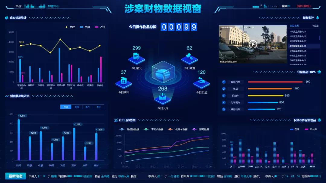 高新兴物管中心采用“1+N”线上、线下、松耦合、集约化的设计,“1”个线上涉案财物管理平台,“N”个线下仓储管理中心。实现对涉案物品的登记、入库、归还、出库、借出等流程的管理;支持对借出、移库、出库的涉案物品进行流程提交、审批以及审批状态的查询;支持按照涉案物品的种类、案件类型、财物状态、时间趋势等多种维度对涉案物品进行统计。