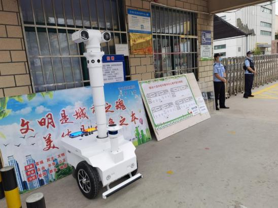 在十四中学校门口,巡逻机器人担任学校守护神,机器人以保障校园园区人们健康安全,学习生活有序,保护校园环境为首要使命,具备全场景全天候巡逻、人脸采集布控、自动报警、紧急求助及对讲、语音播报、自动充电、烟火检测等基础功能,且机器人具有IP55防护等级,在暴雨、大雪天气仍可以正常工作。
