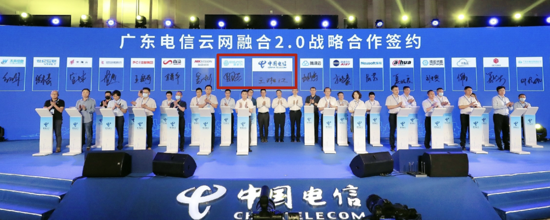 会上,广东电信与高新兴、腾讯云、海康威视等生态(战略)合作伙伴举行了广东电信云网融合2.0战略合作签约仪式,携手产业链合作伙伴共建云网融合生态,共创数字社会的美好未来。
