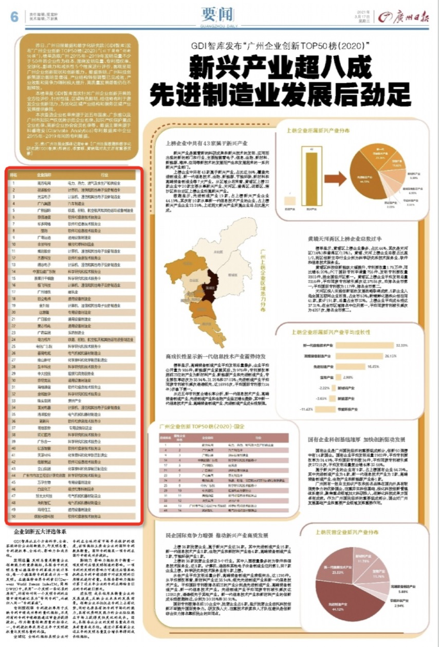 近日,广州日报数据和数字化研究院(GDI智库)发布“广州企业创新TOP50榜(2020)”(以下简称“创新50强”),榜单围绕发明总量、专利授权率、全球化、影响力和成长性5个维度科学、全面、客观评价企业创新能力,高新兴科技集团上榜。