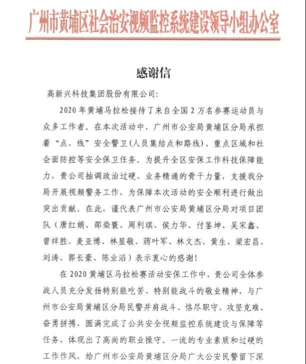 这封来自广州市黄埔区社会治安视频监控系统建设领导小组的感谢信,是对高新兴在黄埔马拉松中安保工作的认可和肯定!