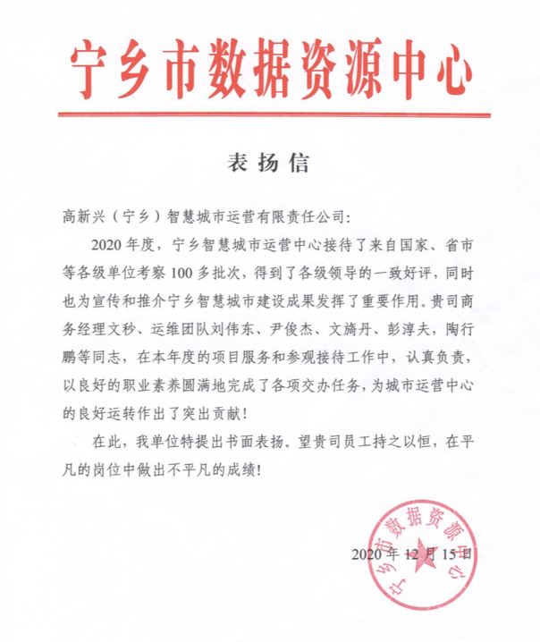 这封来自宁乡市数据资源中心的表扬信,表扬高新兴作为运营单位,全 力协同宁乡市数据资源中心接待了来自国家、省市等各级单位考察100多批次,以良好的职业素养得到了各级领导的一致好评,为城市运营中心的良好运转作出来突出贡献。