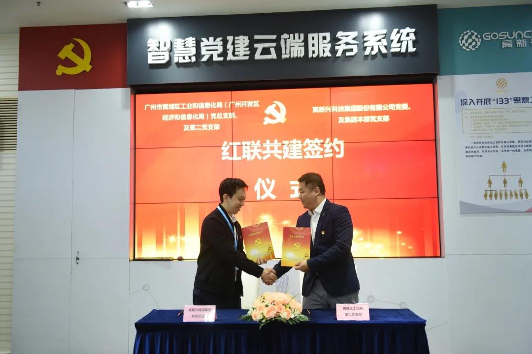 黄埔区工信局第二党支部王凯龙与高新兴科技集团本部党支部书记吴延锷签署“党建共建”协议。