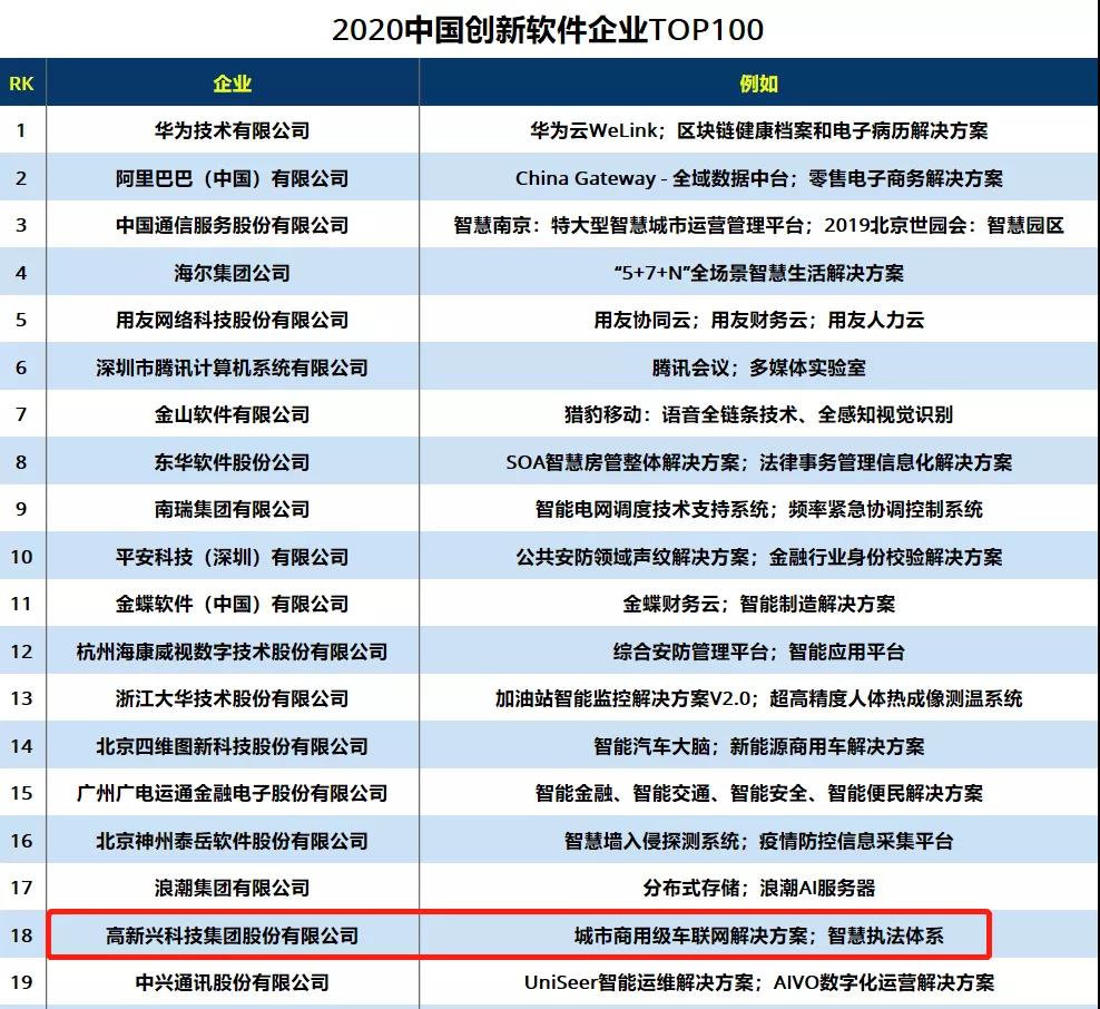 近日,德本咨询、eNet研究院与互联网周刊联合公布的《2020中国创新软件企业100强》榜单,盘点了各个行业中最具代表性和创新性的企业,高新兴凭借突出的创新软件实力与华为、阿里巴巴、腾讯等一同上榜。