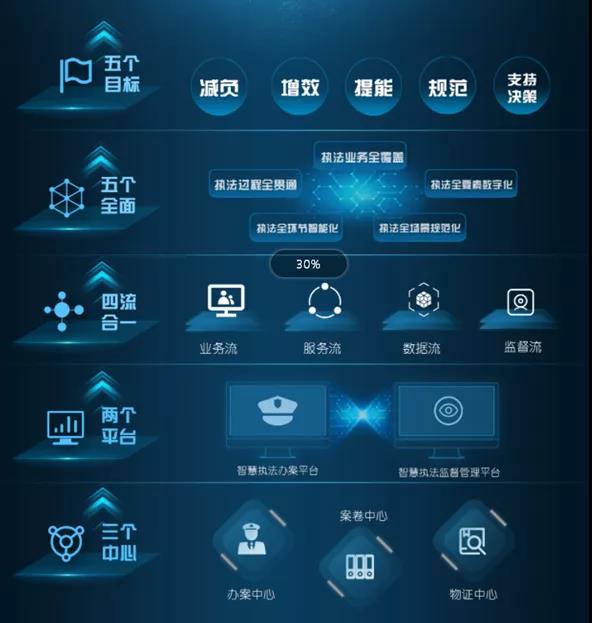 高新兴智慧执法体系是国内首创“云+端”智慧执法体系,以“55423”为设计思路,建设“智慧执法办案平台、智慧执法监督管理平台”两平台、“办案中心、案卷中心、物证中心”三中心,将执法工作的执法场所、在外执法、涉案财物、电子卷宗、移交起诉、庭审判决、执法公开、行政诉讼复议等所有工作环节和相关地点、物品纳入闭环监督管理体系,做到有警必复、有案必受、有错必纠、有问必查,实现规范执法与办案效能双提升。