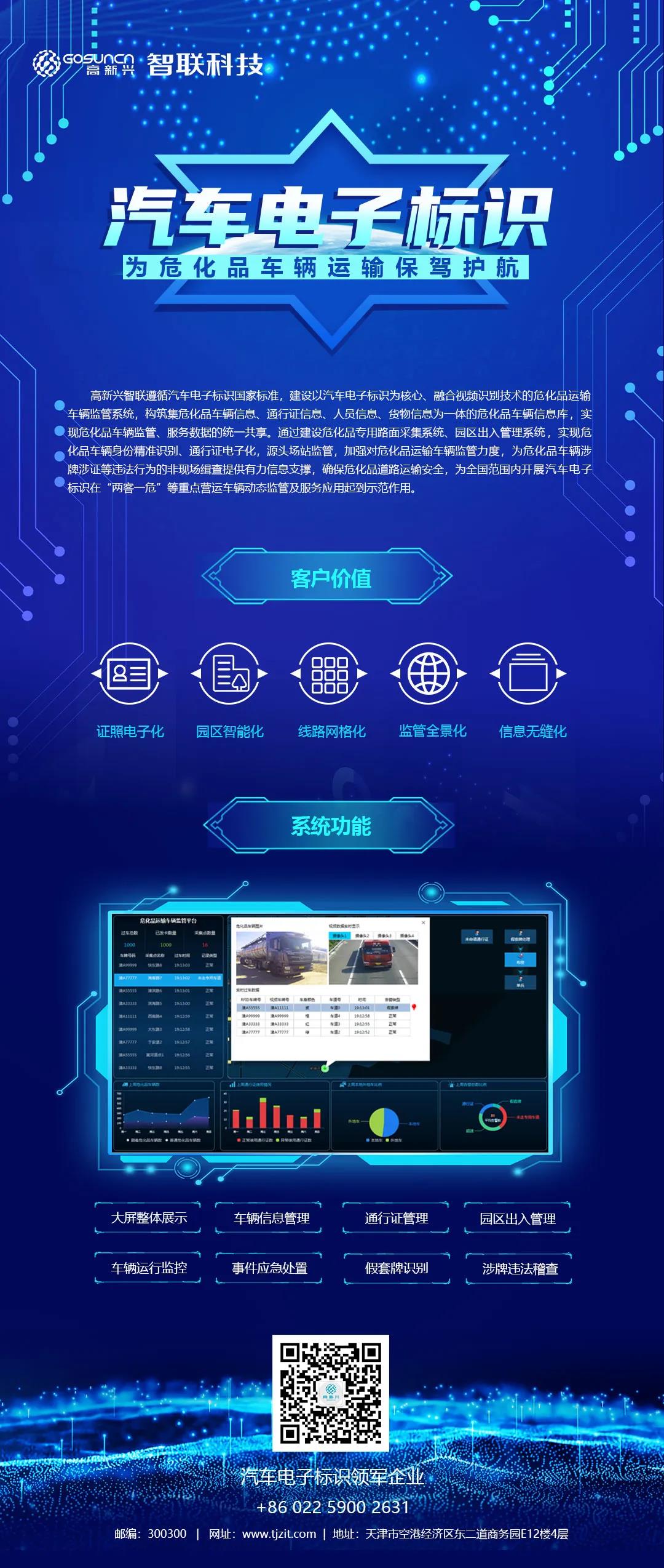 早在2017年,高新兴已经结合天津市危化品运输车辆监管以及滨海新区危化品专用车道车辆管控监控需求,开展汽车电子标识在危化品运输车辆管理领域的测试及示范应用。