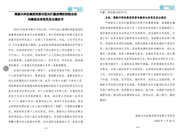 1月28日,党委全体党员发出倡议书《高新兴集团党委对坚决打赢疫情防控阻击战向集团全体党员发出倡议书》,对党员加入疫情防治工作做具体部署,并号召全体党员做承诺:做到防治疫情领命必出、使命必达,凝心聚力、旗帜飘扬!各党支部书记及时传达党委倡议,传达政府文件,并主动配合所在部门负责人开展具体工作。